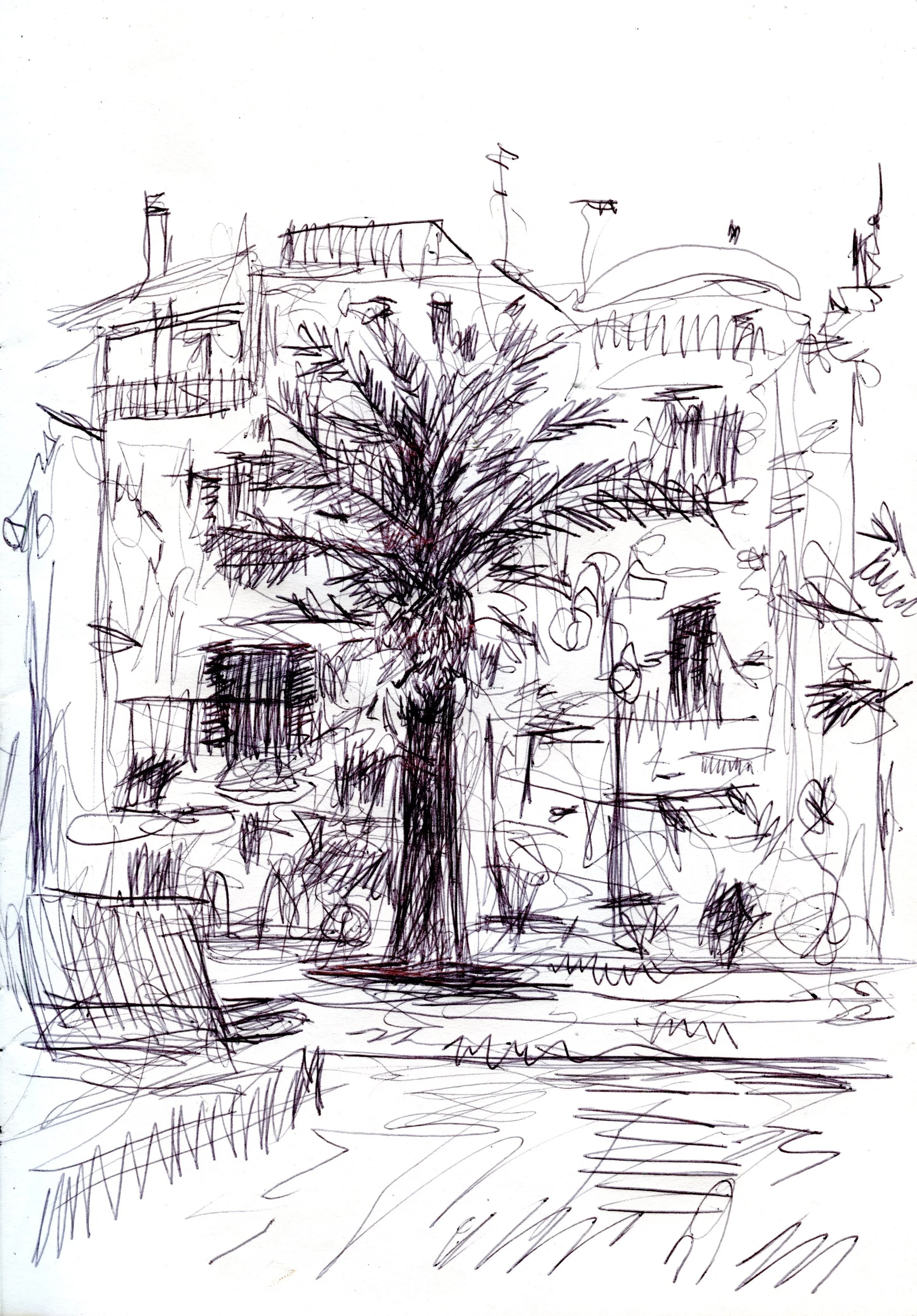 ‘Centro Storico’,’Vista dal Cinema Adriatico’, ‘Fast Abstract Palmtree with Houses with Balconees and Streetlantern’, pencils on paper, ink on paper, sketchbook 21 x 29,7cm